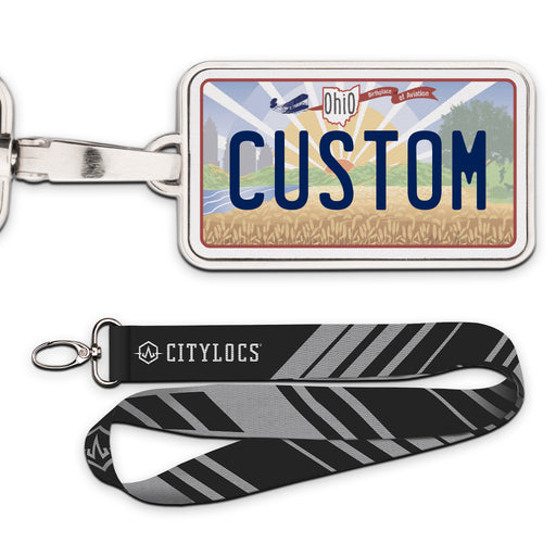 Ohio Plate Pendant • Customizable text• Printed leather in a metal frame• 2 3/8" x 1 1/4"• Lanyard Included