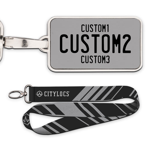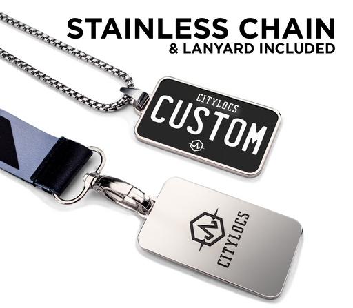 Universal Grey & Black Plate Pendant • Customizable text• Printed leather in a metal frame• 2 3/8" x 1 1/4"• Lanyard Included