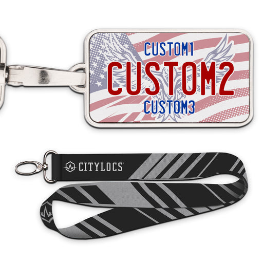 America Universal Plate Pendant • Customizable text• Printed leather in a metal frame• 2 3/8" x 1 1/4"• Lanyard Included