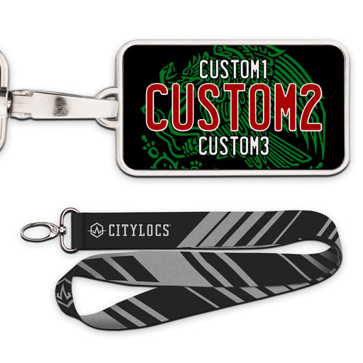 MX Black Green Red Universal Plate Pendant • Customizable text• Printed leather in a metal frame• 2 3/8" x 1 1/4"• Lanyard Included