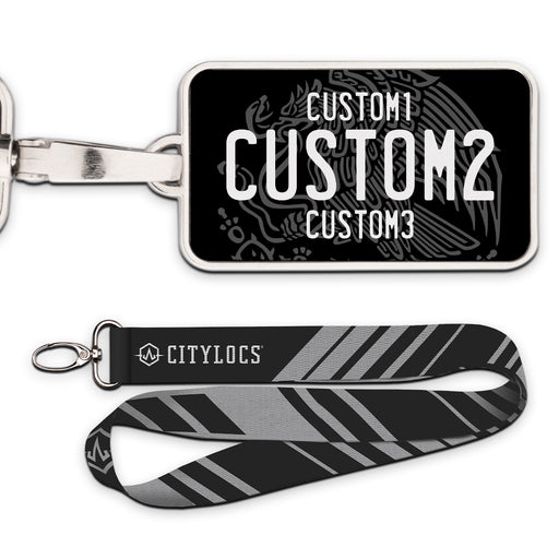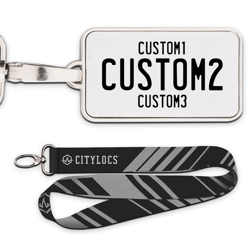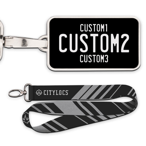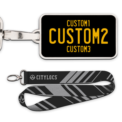 Universal Black & Yellow Plate Pendant • Customizable text• Printed leather in a metal frame• 2 3/8" x 1 1/4"• Lanyard Included