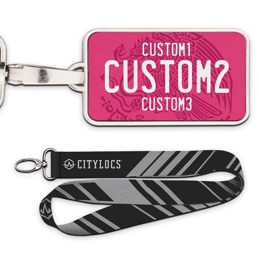 MX Pink White Universal Plate Pendant • Customizable text• Printed leather in a metal frame• 2 3/8" x 1 1/4"• Lanyard Included