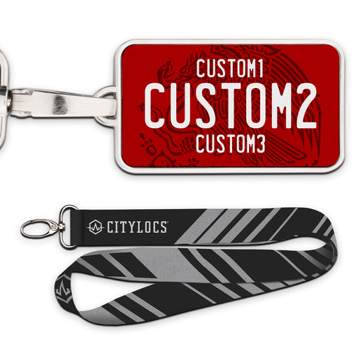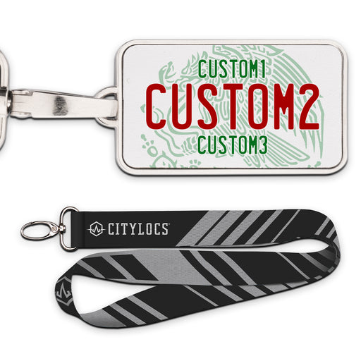 MX White Red Green Universal Plate Pendant • Customizable text• Printed leather in a metal frame• 2 3/8" x 1 1/4"• Lanyard Included