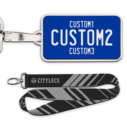 Universal Blue & White Plate Pendant • Customizable text• Printed leather in a metal frame• 2 3/8" x 1 1/4"• Lanyard Included