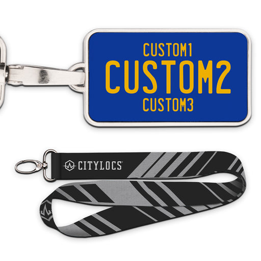 Universal Blue & Yellow Plate Pendant • Customizable text• Printed leather in a metal frame• 2 3/8" x 1 1/4"• Lanyard Included