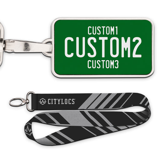 MX Green White Universal Plate Pendant • Customizable text• Printed leather in a metal frame• 2 3/8" x 1 1/4"• Lanyard Included