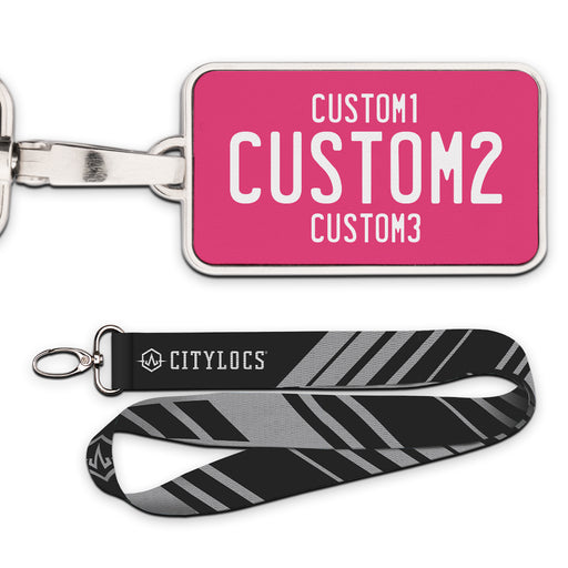 Universal Pink & White Plate Pendant • Customizable text• Printed leather in a metal frame• 2 3/8" x 1 1/4"• Lanyard Included