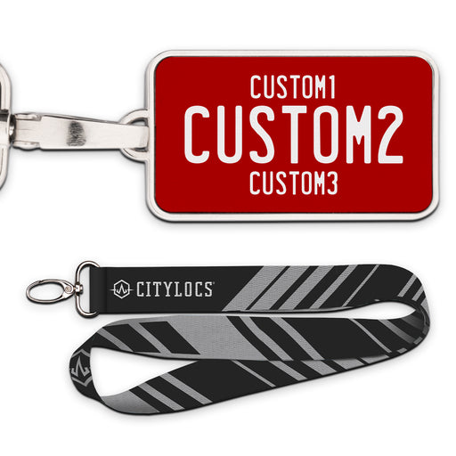 Universal Red & White Plate Pendant • Customizable text• Printed leather in a metal frame• 2 3/8" x 1 1/4"• Lanyard Included
